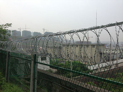 (3)刺絲滾籠由刺絲連接卡扣與固定在支架上的縱向拉筋相連接。縱向拉筋與支架的連接采用Φ2.5mm的冷拔鍍鋅鋼絲繞2圈后擰緊固定。支架設(shè)置在跨度3m防護柵欄的立柱和跨中位置,其中跨度進設(shè)置與立柱上部,支架與防護柵欄采用支架抱箍連接,對于已經(jīng)安裝金屬網(wǎng)片的防護柵欄。刺絲滾籠直接采用Φ2.5mm的冷拔鍍鋅鋼絲或刺絲連接卡扣固定于金屬網(wǎng)橫片和金屬絲上。