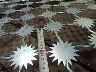 梅花型隔離柵是單層梅花刺網(wǎng),梅花刺直徑不小于7.5cm,刺片厚1.5mm,采用Q235低碳鋼板沖壓而成,網(wǎng)片為鋼絲焊接而成的菱形網(wǎng)孔網(wǎng)片,一般網(wǎng)孔為110*110mm,網(wǎng)絲直徑一般為5mm,每一個(gè)網(wǎng)絲的交叉點(diǎn)焊接一個(gè)梅花刺。