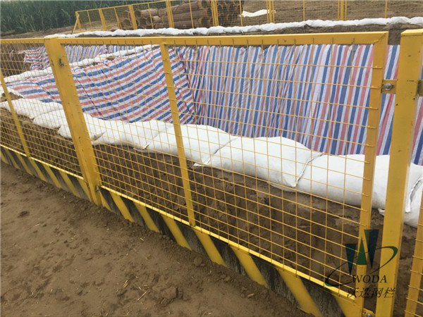 工地護欄網又稱工地隔離柵網、工地臨邊護欄。沃達隔離柵廠根據工地要求將冷拔好的鋼絲經過校直機校平再經過自動切割機切割成客戶要求的長度尺寸。將切割好長度尺寸的鋼絲放在專用模具里(以根據客戶要的網目尺寸做好模具),經過半自動焊機焊接而成網片,再經過最后一道修邊機修邊后,軟邊網片就制作而成。如要加工硬邊網片,可將軟邊網片焊接在外框上(外框一般采用方管或圓管制作,將方管或圓管按客戶要求的尺寸焊接而成),就可制作成硬邊網片 。工地護欄網的材質大多是低碳鋼絲,網片與地面的鏈接方式多為打膨脹螺絲固定或者是混凝土預埋的方式(30-50mm)。