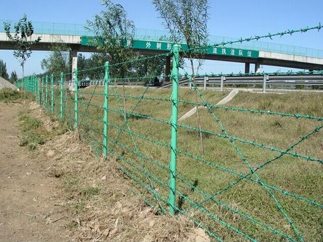 刺鐵絲隔離柵在公路地界線以內30cm處設置,普通路段采用刺鋼絲,并根據生長環境和條件配合使用掛草或綠籬,互通區、服務區采用焊接網,全線隔離柵應進行全封閉布設,在遇到橋梁通道或天然障礙物時應斷開封死,不應留有人、畜進入的空隙,如遇到小涵洞或小障礙物時隔離柵應直接跨過。本項目設計中采用了鍍鋅焊接網和刺鋼絲網相配合使用的形式,在互通區和服務區前后一定范圍采用鍍塑焊接網,在其他路段采用刺鋼絲網。