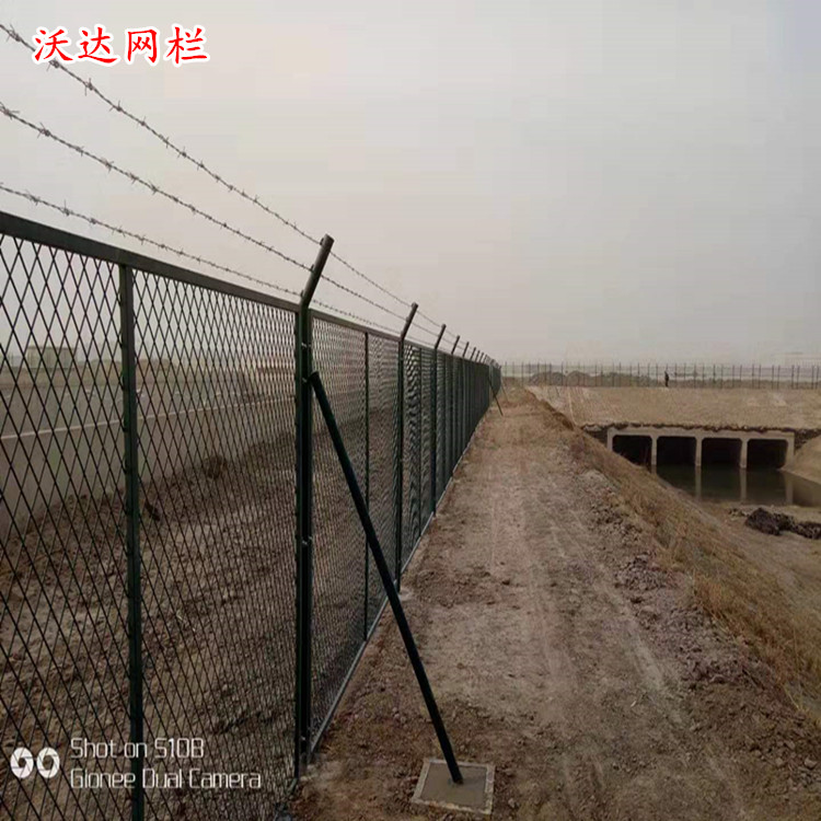 河道鋼板網隔離柵是采用優質低碳鋼絲焊接后PVC浸塑處理,隔離防護網絲徑線徑塑后4.0mm,網孔(菱形孔)60*100mm,立柱48*2.0mm,網外形尺寸1800*3000mm,上端300mm掛鐵蒺藜刺網加固防護,表面處理為墨綠色。以下圖片為河道防攀爬工程實例圖,可供大家參考。我廠可訂購各種尺寸的河道隔離防護網。