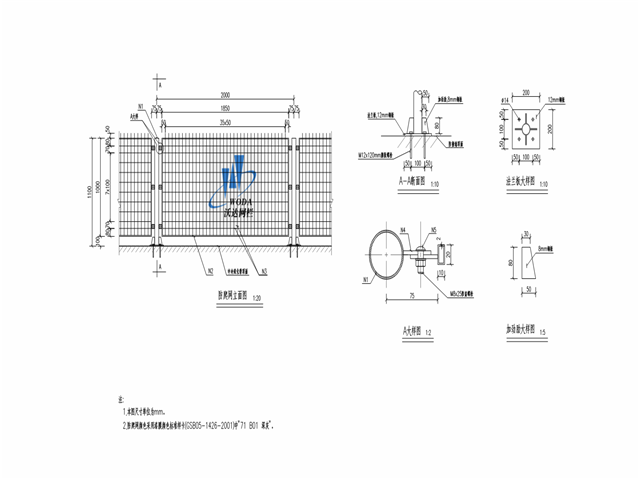 6、防護(hù)網(wǎng)的技術(shù)條件應(yīng)符合<隔離柵技術(shù)條件>(JT/T 374)等現(xiàn)行規(guī)范的要求。