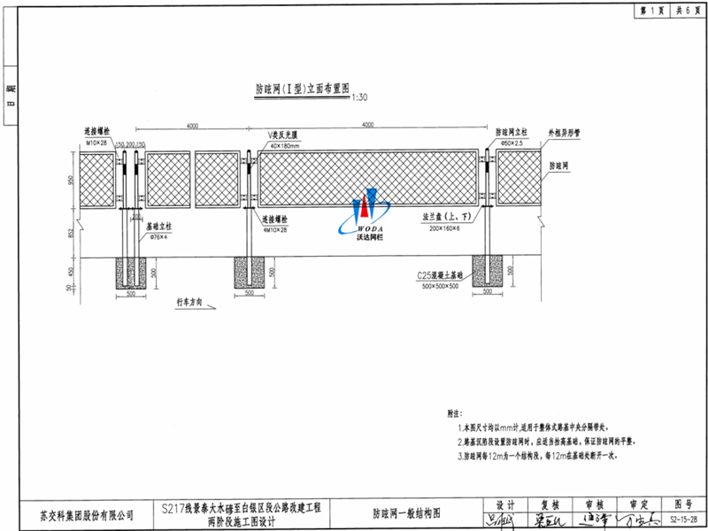(2)防眩網(wǎng)單獨設(shè)置立柱時,可根據(jù)所在位置將立柱埋入土中、設(shè)置混凝土基礎(chǔ)或固定于橋梁、通道、明涵等構(gòu)造物上。設(shè)置混凝土基礎(chǔ),其強度達到設(shè)計強度的70%以上時,才能在立柱上安裝防眩網(wǎng)。