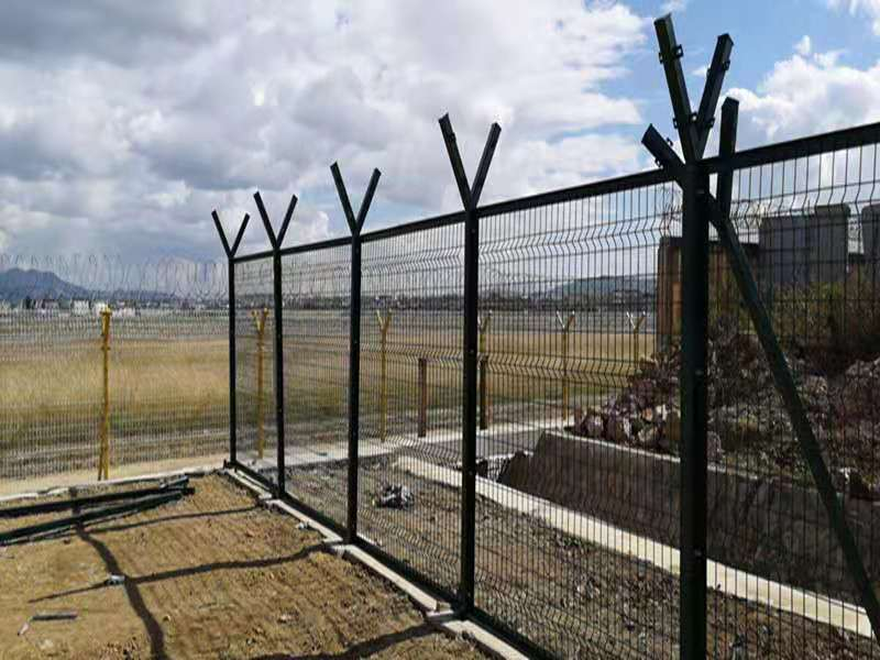 機場護欄網規格是:網高2.4米(帶刀片刺網3米) 50*100mm網孔 帶四道三角彎, 塑后5.0mm 6.0mm 立柱60*80的方管,機場防護網又稱作“Y型安全防御護網”,是由V型支架立柱,加強型焊接片網,安全防盜連接件和熱鍍鋅刀片刺網組成強度和安全防御性級別很高。近年來,被廣泛應用在機場,軍事基地等高安全場所。