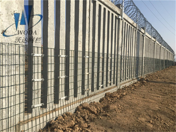 鐵路加密金屬網片隔離柵常見樣式有兩種:鋼板網樣式和網片焊接樣式,四周都焊有扁鐵圈邊固定,使用U型抱箍與混凝土防護柵欄固定。
